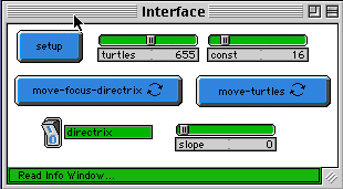 WHAT IS IT? ----------- The model displays two basic conic sections: hyperbolas and parabolas. The figures are generated behaviorally as opposed to algebraically- the turtles attempt to behave like points on the specified shape. The partner to this model is called 'Conic Sections-circle&ellipse.' The turtles use feedback to make decisions about how they behave. They set out in random directions, and then they receive information as to whether or not they are getting closer to where they want to be. If they are getting closer, they continue moving forward in the direction they are going. If they are moving farther away, they set out in a new random direction. This process is akin to the children's game of "Hot & Cold", in which players are told whether they are getting "hotter" or "colder" in relation to a hidden goal. HOW TO USE IT ------------- *Hyperbolas: -Select the number of turtles with the TURTLES slider. -Press SETUP. -Make sure the DIRECTRIX switch is set to 1. -Press the MOVE-FOCUS-DIRECTRIX button to select the two foci as for ellipses. -Press MOVE-TURTLES. Adjust CONSTANT and pick new foci as desired. *Parabolas: -Select the number of turtles with the TURTLES slider. -Press SETUP. -Make sure the DIRECTRIX switch is set to 0. -Press the MOVE-FOCUS-DIRECTRIX button. After this, select first the position of the focus, and then a point through which the directrix will pass. The SLOPE slider sets the slope of the directrix. -Press MOVE-TURTLES. You can use the slope slider to change the slope of the directrix. -Note that CONSTANT has no effect on the parabola. THINGS TO NOTICE ---------------- When forming a hyperbola, turtles adjust their positions from two user-defined foci so that the difference between their distances from the foci attains a value of CONSTANT. When forming a parabola, turtles move until their distance from the directrix, measured perpendicularly, is the same as their distance to the focus. In some cases, the turtles cannot satisfy the rule. In this case, they keep looking and never settle down. Look for examples of this with a hyperbola. THINGS TO TRY ------------- Adjust the slope of the parabola's directrix or the value of CONSTANT for the hyperbola while the turtles are still moving. See how they react to the changes in their environment. You may be able to get a better feeling for the turtles' behavior if only a few turtles are on-screen at one time. Try setting num to a small value (like 16 or 1), and watching the turtles. EXTENDING THE MODEL ------------------- Look at the StarLogoT model Turtles Circling. Watch how the turtles react with each other- something that is missing from 'Conic Sections'. Implement this emergent behavior for one or all of the conics in this project. STARLOGOT FEATURES ----------------- Like more traditional programming languages (e.g. C++), StarLogoT can have functions that return a value to the calling function. The command used is called 'output'- it has one argument, the value to be returned. Look at the function 'minus'. It takes one argument, num, and returns its negative, 0 - num. (The colon preceding num indicates that num is a local variable sent to the called function.)