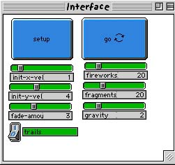 WHAT IS IT? ----------- This program models the action of fireworks. A rocket begins at the bottom of the screen, shoots upwards into the sky and then explodes, emitting a shower of descending sparks. Each rocket, represented by a turtle, is launched upward with an initial x and y velocity. At a certain point in the sky, an explosion occurs, which is represented by a series of turtle hatches. Each hatched turtle inherits the velocity from the original rocket in addition to velocity from the explosion itself. The result is a simulation of a fireworks display. HOW TO USE IT -------------- SETUP sets up the model according to the values indicated by all the sliders and the switch. GO is a forever button that executes the model continually. FIREWORKS creates a random number of fireworks between 0 and the number indicated on the slider. FRAGMENTS determines how many particle fragments will emerge after the explosion of a single firework. GRAVITY determines the gravitational strength in the environment. A larger value will give a greater gravitational acceleration, meaning that particles will be forced to the ground at a faster rate. The inverse is true for smaller values. INIT-X-VEL sets the initial x-velocity of each rocket to a random number between the negative and positive value of the number indicated on the slider. INIT-Y-VEL sets the initial y-velocity of each rocket to a random number between 0 and the number indicated on the slider plus ten. This is to ensure that there is a range of difference in the initial y-velocities of the fireworks. FADE-AMOUNT determines the rate at which the explosion particles fade after the explosiion. TRAILS allows the user to turn the trails left by the explosion particles on or off. In other words, if the TRAILS switch is on 1, then the turtles will leave trails. If it is on 0, then they will not leave trails. If the GO button is stopped and started again after the model begins, all the particles from an explosion explode again. This is because the model is treating each particle as a rocket. Notice also that the particles in the second explosion inherit the velocities from the particles in the first. This model has been constructed so that all changes in the sliders and switches will take effect in the model during execution. So, while the GO button is still down, you can change the values of the sliders and the switch, and you can see these changes being represented on the graphics window. THINGS TO NOTICE ---------------- Experiment with the INIT-X-VEL and INIT-Y-VEL sliders. Observe that at an initial x-velocity of zero, the rockets launch straight upwards. When the initial x-velocity is increased, notice that some rockets make an arc to the left or right in the sky depending on whether the initial x-velocity is negative or positive. With the initial y-velocity, observe that, on a fixed GRAVITY value, the heights of the fireworks are lower on smaller initial y-velocities and higher on larger ones. Also observe that each rocket explodes at a height equal to or a little less than its apex. THINGS TO TRY ------------- Observe what happens to the model when the GRAVITY slider is set to different values. Watch what happens to the model when GRAVITY is set to zero. Can you explain what happens to the fireworks in the model? Can you explain why this phenonmenon occurs? What does this say about the importance of gravity? Now set the GRAVITY slider to its highest value. What is different about the behavior of the fireworks at this setting? What can you conclude about the relationship between gravity and how objects move in space? EXTENDING THE MODEL ------------------- The fireworks represented in this model are only of one basic type. A good way of extending this model would be to create other more complex kinds of fireworks. Some could have multiple explosions, multiple colors, or a specific shape engineered into their design. Notice that this model portrays fireworks in a two-dimensional viewpoint. When we see real fireworks, however, they appear to take a three-dimensional form. Try extending this model by converting its viewpoint from 2D to 3D. StarLogoT FEATURES ----------------- An important aspect of this model is the fact that each particle from an explosion inherits the properties of the original firework. This informational inheritance allows the model to adequately represent the projectile motion of the firework particles since their initial x and y velocities are relative to their parent firework. To visually represent the fading property of the firework particles, this model made use of the turtle command scale-color. As the turtle particles fall to the ground, they hold their pens down and gradually scale their color to black. As mentioned above, the rate of fade CAN be controlled using the FADE-AMOUNT slider.