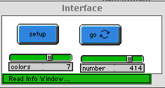 WHAT IS IT? ----------- This model is an example of genetic drift by random selection. It shows that turtles that randomly exchange colors converge on a single color. The model starts with a random distribution of colored agents. Turtles move by wiggling randomly across the screen. When two turtles bump into each other, one turtle loses its color and adopts the color of the other one. After enough turns, a color will gain a slight dominance; by statistical advantage, a dominant color becomes more likely to win the entire grid. However, because the process is random, there will usually be several dominant colors before one color finally wins. The idea, explained in more detail in Dennett's "Darwin's Dangerous Idea", is that trait drifts can occur without any particular purpose or 'selection pressure'. HOW TO USE IT: -------------- The Setup Button intializes the model. The Go Button starts it, and runs continuously. Use the Colors Slider to select the number of colors competing. THINGS TO NOTICE: ---------------- Notice the Graphs of the colors. Often colors that start with a higher initial number fail to win the grid. EXTENDING THE MODEL: -------------------- Try writing the model with a 'randomness' slider that increases the randomness in the turtles? movements. How does this affect the rate at which one color dominates the space? RELATED MODELS: The other models in this set have slightly different mechanisms but also show genetic drift: GD-Local Patches GD-Global Patches GD-Reproducing turtles