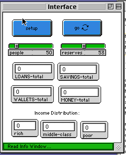 WHAT IS IT? ----------- This model is a simple extension of the model "Bank Reserves". The purpose of the model is to help the user examine whether there is a relationship between the reserve ratio that banks must keep and the degree of equality in the distribution of the money that exist in the system. It models the creation of money in an economy through a private banking system. As most of the money in the economy is kept in banks but only little of it needs to be used (i.e. in cash form) at any one time, the banks need only keep a small portion of their savings on-hand for those transactions. This portion of the total savings is known as the banks' reserves. The banks are then able to loan out the rest of their savings. The government (the user in this case) sets a reserve ratio mandating how much of the banks' holdings must be kept in reserve at a given time. One 'super-bank' is used in this model to represent all banks in an economy. As this model demonstrates, the reserve ratio is the key determiner of how much money is created in the system. In each round, people (represented by turtles) interact with each other to simulate everyday economic activity. Given a randomly selected number, when a person is on the same patch as someone else it will either give the person two or five dollars, or no money at all. After this, people must then sort out the balance of their wallet with the bank. People will put a positive wallet balance in savings, or pay off a negative balance from funds already in savings. If the savings account is empty and the wallet has a negative balance, a person will take out a loan from the bank if funds are available to borrow (if bank-to-loan > 0). Otherwise the person maintains the negative balance until the next round. Lastly, if someone has money in savings and money borrowed from the bank, that person will pay off as much of the loan as possible using the savings. The number of rich people in each moment is calculated by enumerating the number of people whose savings exceed 10 dollars. The number of poor people is the number of people whose loans exceed 10 dollars. The rest of the people are considered to belong to the "middle-class". HOW TO USE IT? -------------- The RESERVES slider sets the banking reserve ratio (the percentage of money that a bank must keep in reserve at a given time). The PEOPLE slider sets the number of people that will be created in the model when the SETUP button is pressed. The SETUP button resets the model: it redistributes the patch colors, creates PEOPLE people and initializes all stored values. The GO button starts and stops the running of the model and the plotter. RUNNING THE MODEL ----------------- 1) THINGS TO NOTICE ------------------- There are numerous display windows in the interface to help the user see where money in the economy is concentrated at a given time. SAVINGS-TOTAL indicates the total amount of money currently being kept in savings (and thus, in the banking system). LOANS-TOTAL is the amount the bank has lent out. WALLETS-TOTAL gives an indication of the total amount of money kept in the peoples' wallets. This figure may be negative at times when the bank has no more money to loan (the turtle will maintain a negative wallet balance until a loan is possible). MONEY-TOTAL indicates the total-amount of money currently in the economy (SAVINGS-TOTAL + WALLETS-TOTAL). Because WALLETS-TOTAL is generally kept at 0 in this model (we are assuming that everyone desposits all they can in savings), MONEY-TOTAL and SAVINGS TOTAL tend to be the the same. The three lower monitors show the number of rich, middle-class, or poor people. A person's color tells us whether he is rich (green color), middle-class (grey), or poor (red). There are four plot windows to help you observe the operation of the economy. Plot window 1 plots the number of LOANS-TOTAL and MONEY-TOTAL as a function of time. Plot window 2 plots the number of SAVINGS-TOTAL and WALLETS-TOTAL. Last but certainly not least, plot window 3 plots income distribution. This is the feature which you should pay more attention to. The green pen plots the number of rich people; the black pen plots the number of middle-class people; the red pen plots the number of poor people. In general, it is much easier to observe the plot windows than the monitors. The fourth plot window is a histogram that depicts how wealth is distributed among the population. Wealth is distributed in ten bars. Each bar corresponds to one tenth of the population. 2) THINGS TO TRY: ----------------- Vary the RESERVES rate as the model runs, and watch the effect this has on income distribution. You can either watch the three Income Distribution monitors, or the Income Distribution plot window. Set RESERVES initially to 100 and observe the Income Distribution graph (plot window 3). Gradually lower RESERVES and see the effect on wealth distribution. By shifting RESERVES and observing the Income Distribution, can you see whether the two of them are positively, negatively, or not related? EXTENDING THE MODEL: -------------------- Try extending the model to include payments of interest in the banking system. People with money deposited in savings should be credited with interest on their account (at a certain rate) from the bank from time to time. People with money on loan should make interest payments on their account to the bank from time to time. This model has turtles interact in a very simple way to have money change hands (and create a need for loans). Try changing the model so that money moves around the system in a different way. STARLOGOT FEATURES ------------------- RELATED MODELS AND REFERENCES ----------------------------- See "Bank Reserves".