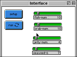 Set it up by pushing the SETUP button once. This will randomize the positions of fish, crabs, seaweed and jellyfish. You can control the number of agents of each kind with the appropriate sliders. Then press RUN.