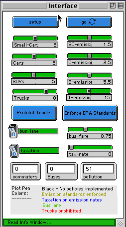 WHAT IS IT? =========== The purpose of this model is to introduce you to the problem of air pollution. The model enables you to set and change the value of numerous variables and observe the effects of your actions on the amount of total air pollution. Let's separate the variables that you can control into 3 groups. 1st group: You can set the number of vehicles in the model. In particular, you can set the number of small cars, passenger cars, Sport Utility Vehicles (SUVs), and trucks. 2nd group: You can set the average emission rates for each category of vehicles. 3rd group: You can implement several anti-pollution policies such as enforcement of the Environmental Protection Agency (EPA) emission rates, taxation of each driver according to the emission rate of his/her vehicle, introduction of a bus lane, and the prohibition of truck operation. HOW TO USE IT ============= Explanation of elements in the Interface window: - There are 4 sliders in the left-hand side of the interface window. You can move any of these sliders to set the number of vehicles in the respective category to a number from 0 to 10. - There are also 4 sliders in the right-hand side of the interface window. You can move any of these sliders to set the average emission rate of all vehicles in the respective category. - There are two buttons, two switches, and two sliders which help implement four policies that aim to decrease the level of air pollution. In particular: - The "Prohibit Trucks" button eliminates all trucks from the model. - The "Enforce EPA Standards" button sets all emission rates to half a unit lower than the Environmental Protection Agency's emission rate standard (i.e. 0.5 lower than the maximum emisison rates allowed). - The "bus-lane" switch begins and ends the implementation of the bus-lane policy. - The "taxation" switch turns taxation ON and OFF. - The "bus-fare" slider sets the price of a bus ticket. - The "tax-rate" slider sets the rate of taxation on emission rates. A more detailed explanation of the aforementioned policies is given later. - There are also three monitors towards the bottom of the Interface window: COMMUTERS: displays the current number of commuters. BUSES: displays the number of buses currently in use. POLLUTION: displays the level of air pollution in a scale from 0 to 100. - At the bottom of the window there is an explanation of the color of the plot pen. This is necessary because the color of the plot pen changes while the model is running. - If the plot pen color is black, no policies are implemented. - If the color is yellow, only emission standard are enforced. - If it's blue, taxation is implemented, and emission standards MAY be enforced at the same time. - If it's green, the bus lane policy is implemented, and emission standards and/or taxation MAY be implemented. - If it's red, trucks are prohibited, and emission standards and/or taxation and/or the bus lane policy MAY be implemented. To use the model: First of all, press the "setup" button once in order to set up the model. Now, set the number of vehicles in each category according to your liking. Then, set the average emission rates for each category of vehicles as you wish. Hint: If you want the emission rates to be most realistic, press the button "Enforce EPA Standards" and then increment each emission-rate slider by 0.5. Press the "go" button to start the model. The vehicles will start moving and emitting pollution. In order to get familiar with the model, you can increase/decrease the number of vechicles and/or the emission rates and observe the effects of your actions on pollution. THINGS TO NOTICE ================ There are 4 ways to observe the current level of air pollution: 1. The darker the sky, the more the pollution. 2. There is a pollution warning signal right above the sky. As long as the signal is green, pollution is relatively low. If the yellow light turns on, you should try to decrease pollution or at least prevent it from rising any further. If the red lights turn on, then pollution levels are dangerously high! You should take immediate action to significantly lower the level of pollution. 3. There is a monitor labeled "pollution" in the interface window. Pollution level is shown in a 0-100 scale. That means that numbers below 40 represent relatively low levels of pollution; numbers between 40 and 60 demonstrate that the level of pollution is close to unacceptable levels; numbers higher than 60 represent unacceptable levels of pollution! 4. There is a plot window that depicts the level of pollution with respect to time. THINGS TO TRY ============= Once you understand the basic operation of the model, you can move on to more interesting experiments. There are 4 policies that you can implement in order to evaluate their effectiveness on reducing air pollution: 1. Press the button "Enforce EPA Standards" to set emission rates to the highest level allowed by EPA. Note: You will only see an improvement in pollution levels if emission rates were previously set to levels higher then the EPA standards. 2. Set the "taxation" switch to "1". Increment the "tax-rate" slider progressively. At the same time, adjust the "bus-fare" slider. Each driver (except for truck drivers) will make his own decision according to the following rules: - Each driver values the benefit of using his own car more/less than any other driver. I call this benefit, the driver's "utility". - Each driver compares the amount of tax he has to pay to his utility times the bus-fare he has to pay in order to take the bus. - If the tax is higher than the bus-fare times the utility, the driver will leave his car and take the bus. Otherwise, he will use his car. If you decrement the tax rate, commuters will make similar decisions and might choose to leave the bus and use the vehicle they used to operate. 3. Set the "bus-lane" switch to "1". This action causes the following effects. First, buses use a separate lane at the bottom of the graphics w