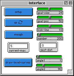 WHAT IS IT? ----------- "In rugby, after a try has been scored, the scoring team has the opportunity to gain further points by 'kicking a conversion'. The kick can be taken from anywhere on an imaginary line that is perpendicular to the try line (i.e the goal line) and goes through the location on the try line where the try was scored. Where should the kick be taken from to maximize the chance of a score?" This problem, taken from a British mathematics textbook, was the inspiration for this model. The problem and its StarLogoT solution is described in greater detail in Wilensky's "Modeling Rugby: Kick First Generalize Later?" published in the International Journal of Computers for Mathematical Learning, vol 1 no. 1. Instead of trying to solve it with calculus or geometry, we'll take a probabilistic approach and use StarLogo turtles and patches. Essentially, we'll have a player stand on each patch along the imaginary kick line (the vertical yellow line), and kick thousands of balls in random directions. Players receive one 'point' for each conversion they score. The idea is that since each kick-angle is randomly chosen, those players who score the most points must be standing in the best positions. Note that this approach is quite different from the analytic approach. In the standard mathematical solution, one is expected to equate best chance of scoring with maximal angle from the kick line to the goal. In the probabilistic solution, this is not assumed. It emerges as the result if the playing field is assumed to be uniform. If, however, the model is extended to include wind or grass grain or decaying kick speeds, this solution adjusts gracefully in contrast to the brittle analytic solution. For a fuller account, see Wilensky, U. (1996). Modeling Rugby: Kick First , Generalize Later? International Journal of Computers for Mathematical Learning. Vol. 1, No. 1. p. 124 - 131. http://www.tufts.edu:80/~uwilensk/papers/rugby/rugby.html HOW TO USE IT ------------- There are two main parts to 'rugby'. First, we have the sequence of rounds during which we find the best positions for kicking goals using the procedure described above. Second, we have a set of controls for drawing the level-curves associated with the given goal-size. These additional controls allow us to visualize the field of solutions for the analytic case of uniform field. We use four sliders to initialize 'rugby'. -GOAL-SIZE determines the size of the goal. -GOAL-POS is the x-coordinate of the left goal-post. It is placed GOAL-POS units away from the leftmost screen-edge. -Hence the left goal-post is at (0 - screen-edge + GOAL-POS, screen-edge), and the right goal-post is at (0 - screen-edge + GOAL-POS + GOAL-SIZE, screen-edge). -PERP-LINE determines the x-coordinate of the kick-line. The kick line is PERP-LINE units away from the leftmost screen-edge. -Note that the values of PERP-LINE, GOAL-SIZE, and GOAL-POS may need to be adjusted to fit your current screen-size. -NUMBER is the number of balls that will be kicked in a single round. Press the SETUP button to initialize the model, after you've chosen appropriate values for the sliders. When you're ready to run it, press the GO forever-button. This will commence the kicking; rounds will be repeated and results accumulated until you press the ENOUGH button. ENOUGH will turn off the GO button, and prepare a final report of results and compare them to an analytic solution, in the Output Window. Watch the left-hand side of the screen as the model runs. A histogram is being plotted of total points scored from each position along the kick line. The best scores (to date) for each round are highlighted in pink -- the others are drawn in blue. You can also graphically view the level-curves (the curves of constant viewing angle, i.e. the curve along which the goal appears to be the same size. From straight ahead, the goal appears maximally wide. From a shallow angle, the goal looks smaller at the same distance from the try line) associated with the viewing angle of the goal for each patch. The two sliders ANGLE1 and ANGLE2 determine the bounds of the viewing angle (the angular size) you'd like to see level curves for; the DRAW-LEVEL-CURVES button will then draw these curves. The CURRENT-MAX monitor shows the number of goals scored by the best "patch", (i.e the best position on the kick-line) The BEST-DIST monitor shows the distance to the try line for the best kicking position (to date). THINGS TO NOTICE ---------------- Given a particular goal-line and kick-line, what are the best positions to kick from? First try running the model with PERP-LINE of 10, GOAL-SIZE as 25, GOAL-POS as 50, and NUMBER as 1000. Change the position and size of the goal. How do the 'best positions' change in relation to the goal's position? Then change the position of the kick line, and redo all trials. How does the performance compare when the kick line is farther away? Or closer? Examine the histogram at the left edge of the screen. What do you notice about it? What shape does it have? What does it tell you about the best locations to kick from? THINGS TO TRY ------------- Can you generalize the results given by 'rugby'? What are the relationships between the kick-line, the goal, and the best patch to kick from? Re-read the problem description given in the first paragraph of "What Is It?" Do you think that this model adequately answers the question asked? Why or why not? What alternative solutions could you provide? It's important to understand that this StarLogo project isn't exactly the standard method for solving problems of this sort. (A more 'classical' approach would be to use techniques from geometry or calculus.) However, there are many advantages offered by the StarLogo method. Consider the following other variables that might affect the solution to the 'rugby conversion problem'- wind speed, grass height, or the size/weight/skill of the player to kick. (Such a problem that considers 'real-world' par