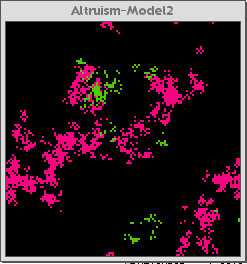 Figure 1a below is the control interface for the Altruism-Model 1. Figure 1b shows the model when it starts running. The pink agents are altruistic and the green are selfish. Figure 1c shows the model after it has run for about 100 generations (about thirty seconds running on a typical project iMac computer).