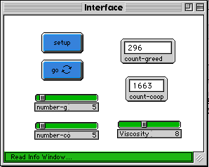 In refining this first cooperation model into a second cooperation model, Geoff researched the evolutionary biology literature on population viscosity The only change to the model was to add a slider variable called Viscosity to the control interface. The viscosity variable limited the range of movement of the cows, thus keeping the populations localized in their grazing habits. The change in the model behavior was dramatic.