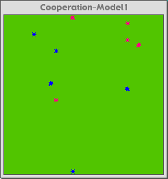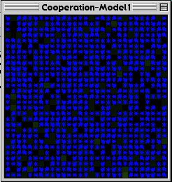 The setting was informal and the activities were conducted in the research labs at the CCL. The students first discussed with us their background in evolutionary theory, and their intuitions about the evolution of altruistic and cooperative behaviors. Each student then explored the StarLogoT environment until s/he was comfortable with his/her understanding of turtle and patch agents. We then discussed the idea of emergent phenomena. All of the students were engaged in this inquiry, and a few immediately worked with us to develop simple models of collective behavior so that they would understand the concept of "emergence" in their own terms. Once the students were comfortable with StarLogoT, they began explorations of a set of models about the evolution of cooperation and altruism -- models designed specifically for the EACH project.