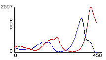 (left) and 2b (right). Two different outcomes from rule-sets W1 + S1. Red lines represent predator population size and blue lines represents prey population size.After Talia ran her model several times, she noticed that one of two general outcomes would always occur. Either there were oscillations until all the sheep were eaten, whereupon the wolves died from starvation (figure 2a). Or, there were oscillations until the number of sheep dipped too low and the wolves all died off, at which point the sheep reproduced exponentially (figure 2b). Her simple rule-set thus succeeded in producing oscillations, but the pattern was unstable. The next logical step in the modeling process was for her to determine the cause of this instability and correct her model. In order to do this, Talia engaged in a process of successive revision she would repeatedly devise some variation of her rule-set, and then program it and observe its effects.