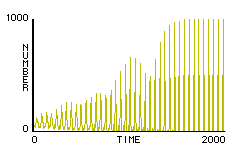 Paul executed rule-set F2 using 1000 fireflies, and was amazed to see the model fireflies converge upon a single rhythm before his eyes (figure 4). Paul was encouraged by the initial results of his investigation, and was left with even more questions to consider and to research. For example, he was intrigued by the ability of some fireflies to adapt not only the timing of their flash, but also the duration between flashes. The papers he had looked at gave no complete theory of how this could be done. He was also interested in customizing his model to reflect the idiosyncrasies (e.g. multiple consecutive flashes, responses to irregular stimuli) of particular species, such as Pteropox Malacae and Photinus Pyralis. Though he began his inquiry with only a single question in mind, he found that his questions multiplied as his research continued.