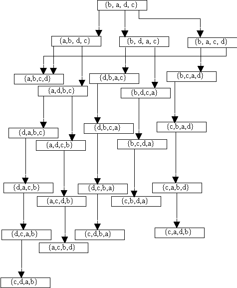 After an initial state and a set of operators has been defined, we will have defined an abstract representation of the problem called the ‘problem space’. The problem space is the set of all possible states the problem solver can construct from the initial state using the available operators. The problem space for our example problem consists of all possible permutations of the four elements in the initial set, since the flip operator makes it possible to generate any possible ordering, as illustrated in Figure 1.