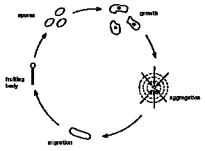 At this point, the slime-mold cells start acting as a unified whole. Rather than lots of unicellular creatures, they act as a single multicellular creature. It changes shape and begins crawling, seeking a more favorable environment. When it finds a spot to its liking, it differentiates into a stalk supporting a round mass of spores. These spores ultimately detach and spread throughout the new environment, starting a new cycle as a collection of slime-mold cells. (See figure 1, reproduced from Prigogine and Stengers (1984)).