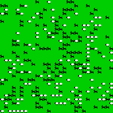 Benjamin, a student at a Boston-area high school, set out to create a StarLogo program that would simulate the dynamics of an ecosystem. At the core of his simulation were turtles and food. His basic idea was simple: turtles that eat a lot of food reproduce, and turtles that dont eat enough food die. Benjamin began by making food grow randomly throughout the StarLogo world. (During each time step, each StarLogo patch had a random chance of growing some food.) Then he created some turtles. The turtles had very meager sensory capabilities. They could not "see" or "smell" food at a distance. They could sense food only when they bumped directly into it. So the turtles followed a very simple strategy: Wander around randomly, eating whatever food you bump into.