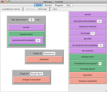 DeltaTick is a low-threshold visual programming interface for the NetLogo multi-agent modeling environment. It provides a graphical drag-and-drop interface that lets you build fully functional agent-based models quickly and easily. It also provides you with access to view and edit the text-based NetLogo code that is generated by any user's configuration of programming blocks.
