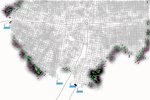 This model simulates points of information and/or resource exchange in an urban environment, and examines the spread of the concept or resource through a population of agents.