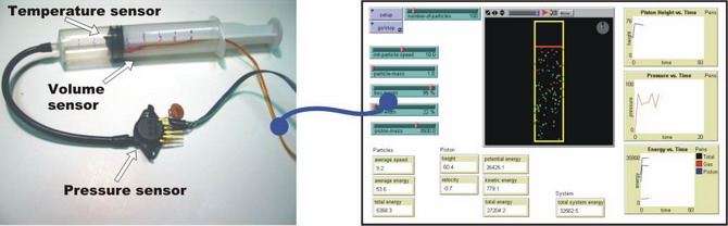 A plastic syringe with temperature, volume (strech) and pressure sensors. The information is displayed in the NetLogo model and users can see the impact in temperature of varying volume and pressure.