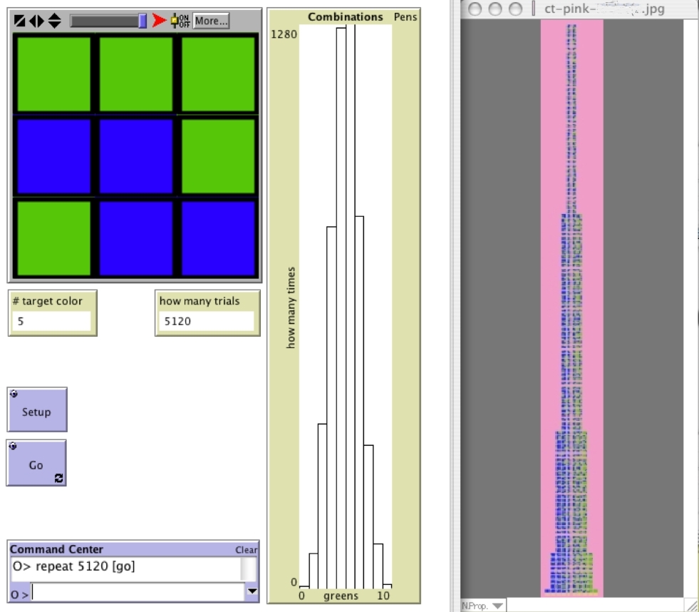 It is no simple task for a middle-school classroom to build the Combinations Tower. Individual students use inductive, deductive, recursive, and pattern-finding algorithms to determine the heights of the columns and to generate the permutations. There is a great deal of work to accomplish, and resources are limited. So students need to distribute the work to task forces. The biggest challenge is avoiding repeated permutations. So the mathematical construct of distribution is grounded in terms of classroom agents, labor, and product. The Combinations Tower that students engineer and build becomes associated with probability when explored through the NetLogo models, such as 9-Blocks . The combinatorial space is distributed in a form that anticipates the frequency distributions in empirical experiments. Reciprocally, the distribution resulting from the experiment lends new meaning to the actions of performing combinatorial analysis. That which was essentially a collection of all different permutations now becomes a representation of the relative ubiquity of classes of objects in the world.