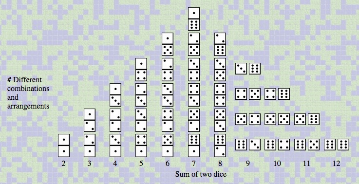Dice Stalagmite is a model for thinking about independent and dependent random events. In this model, outcomes from two independent events -- the rolling of "Die A" and "Die B" -- are represented in two different ways. On the left you see these outcome pairs plotted as individual events -- this representation ignores the fact that the two dice were rolled as a pair and just stacks each die outcome in its respective column within the picture bar chart. On the right, you see the same two dice accumulating as pairs. Note that the bar chart on the left has only six columns: 1, 2, ...6 -- one for each possible die face. The chart on the right has 11 columns -- 2, 3,...12 -- because it groups outcomes by total, and there are eleven possible totals (the columns are broader, because they must accommodate two dice). Below is the combinatorial space of all possible pairs of dice grouped in eleven columns according to their total (2, 3,..., 12).
