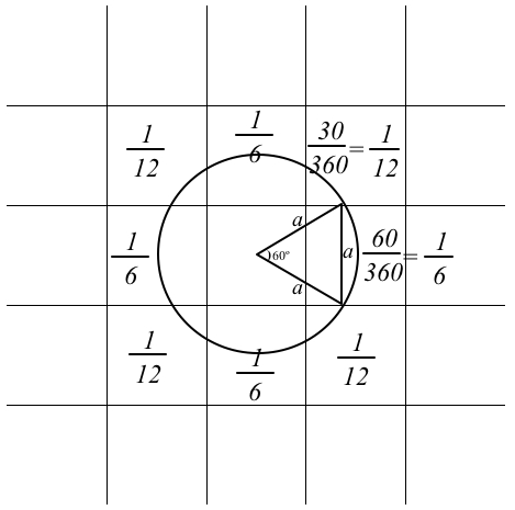 Equidistant Probability is perhaps an unusual model -- it bridges two domains of mathematics that are seldom found on the same page: geometrical analysis and probability. Say you have selected three vertices and have arranged them so that they flank a single square (e.g., Preset3). Slow down the model, using the slider on the top-left corner of the graphics window, and watch closely what happens when you press FIND EQUIDISTANT POINT. From each of the three vertices, a single turtle darts forward in some random direction. The turtles walk in discrete steps of a size that is equal to the side of a square. If all three turtles land on the same spot, then that spot is equidistant from their respective points of departure. The diagram, below, helps compute the chance of each turtle landing on a square that is neighboring its own square. The collection of all points that a turtle can land on when heading at a random direction and stepping forward 1 step describes a circle of radius 1 step. Geometrical analysis of arcs of this circle that lie in neighboring squares shows that the arc is 1/6 of the circle. So the turtle has a 1/6 chance of landing on each of the four North/West/South/East neighbors. 4/6 are 2/3, so 1/3 is left to share between the four corners. So the turtle has a 1/12 chance of landing on each of the four corner neighbors. Your three turtles each has a 1/6 chance of landing in the square their vertices enclose. To determine the likelihood of the compound event when all three turtles each got just that 1/6 of a chance, we multiply the three chances. 1/6 * 1/6 * 1/6 is 1/216. So once in every 216 attempts, on average, all three turtles will land on that square. Run the experiment under these conditions and see if you get a mean of 216 attempts until success.