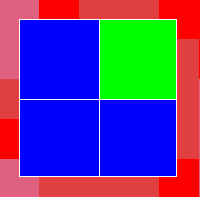 ProbLab Genetics demonstrates some connections between Probability and the Natural Sciences. Specifically, the model frames a combinatorial space in terms of a genetic pool of fish. Fish vary by body and fin color, each of which can be either green or blue. Underlying this variation are dominant and recessive genes, expressed in "4-blocks." A "4-block" (see example, below) is a 2-by-2 array of squares, each of which can be either green or blue (see also 9-BLock Stalagmite). Initially, fish are randomly distributed by genotype, so if you add enough fish -- using the ADD FISH button -- they will be more or less equally distributed by genotype. Then, when you press GO ONCE or GO, the fish swim around, mate, and reproduce, and the distribution changes. The model allows you to look "under the hood": You can study a Mendel-type visualization of the combinations of dominant and recessive genes that underlie changes and trends in genetic distribution.