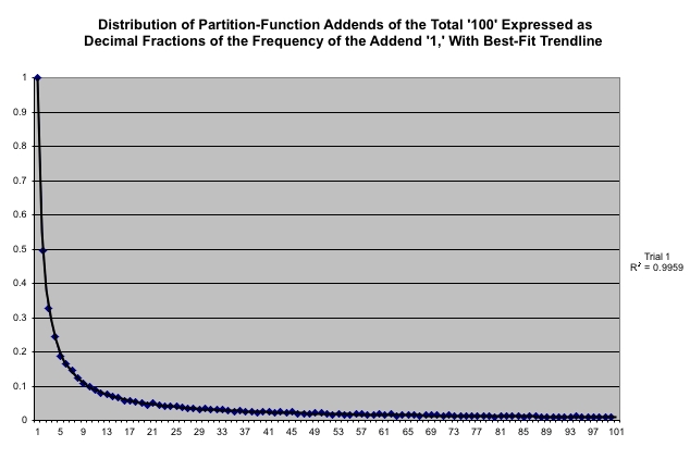 In how many different ways can you add up to 20? Well, there's just [20], then there's [19 + 1], [18 + 2], [18 + 1 + 1], [17 + 3], [17 + 2 + 1], [17 + 1 + 1 + 1], etc. all the way to [1 + 1 + 1 + 1 + 1 + 1 + 1 + 1 + 1 + 1 + 1 + 1 + 1 + 1 + 1 + 1 + 1 + 1 + 1 + 1], and that's without caring for the partitions' order. If we figured out all the different combinations, which number would occur most often? It looks like '1' wins easily. But how ubiquitous is it? How many more '1's are there as compared to, say, 7's? This model randomly generates many partition combinations of a target-total. If enough combinations are generated, the shape of the graphs stabilizes to show the relative frequencies of the addends.
