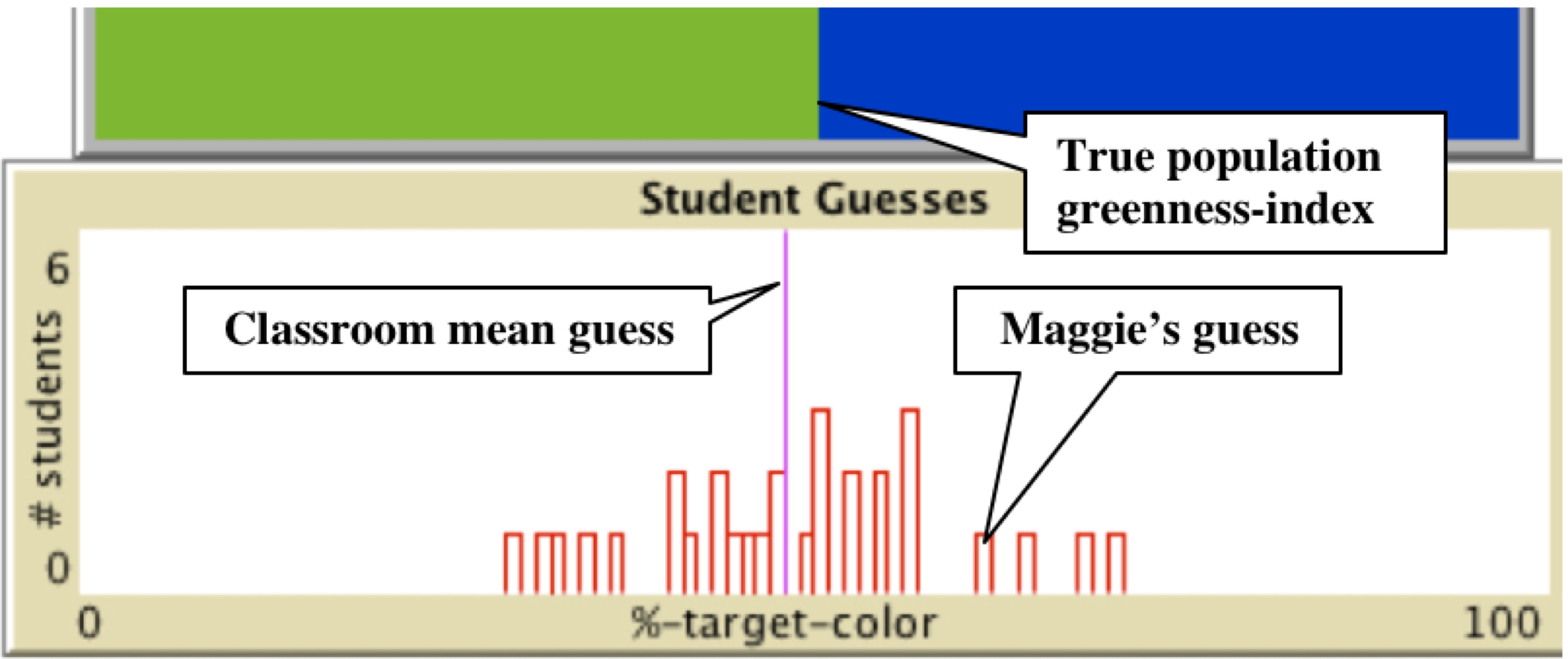 The objective in this model is to determine, through sampling, the greenness of the population. That is, if you were to pick a single tiny square from this "population" of thousands of green-or-blue squares, what is the chance that this square comes out green? Press on 'Sample,' and then click on the graphics window. Using the appropriate slider and switches, you can change the size of the sample with the sample-block-side slider, you can add a grid, and you can keep your samples. In the classroom, each student has their own computer interface from which they make their individual selections of samples. Then they input their guesses. Click on 'Simulate Classroom Histogram' to get a sense of how these guesses might look once they are processed by the central server.